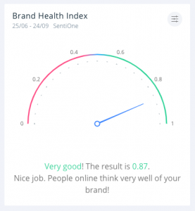 Go to your Analysis module, click “Customise”, add new widget from the Sentiment category and choose Brand Health. When you click, it will be automatically added to the bottom of your dashboard. And remember to steer clear from the red zone!