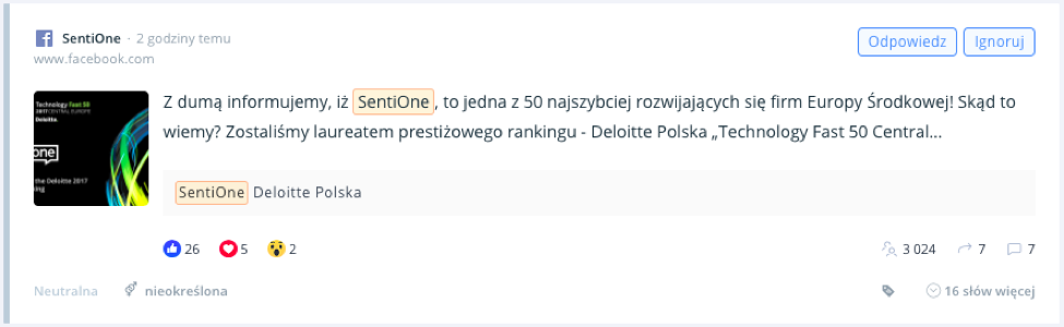 SentiOne analyzuje příspěvky na Facebooku z hlediska sentimentu, pohlaví autora, dosahu, počtu sdílení a komentářů a od teď také nově z hlediska reakcí, jako tyto: