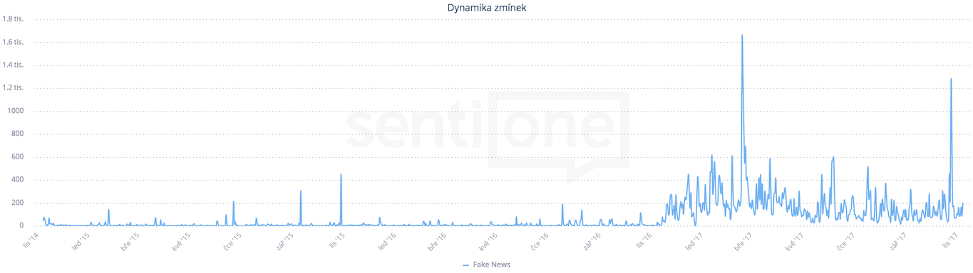 Během posledních let se počet fake news rapidně zvýšil. V České republice se tento termín za poslední 3 roky rozmohl hlavně v roce 2017, jak můžeme vidět na následujícím grafu zmínek v čase. Od začátku tohoto roku bylo vygenerováno více než 75 000 zmínek, kdy největší nárůst potom nastal zejména v období února v souvislosti s hrozbami falešných zpráv o NATO pocházejících z Ruska a dále v říjnu během probíhajících parlamentních voleb.