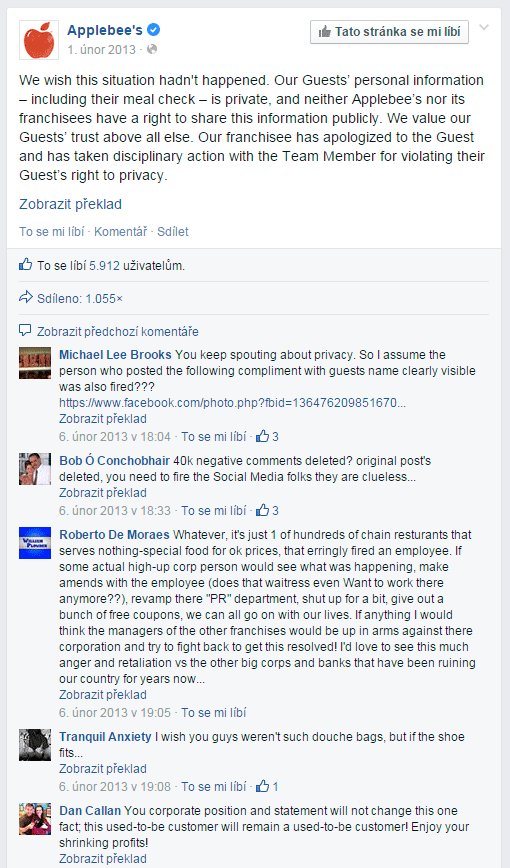 Původní vysvětlení Applebee’s by možná obstálo, kdyby nedostalo ránu v okamžiku, kdy byl nalezený jiný účet, avšak díky chvále na něm, nikdo nebyl za tento – v zásadě stejný čin, tj. porušení soukromí zákazníka – propuštěn. V této situaci mohli svůj postoj přehodnotit a dotčeného pracovníka přijmout zpět (i když by možná porušili své interní zásady – ale i firma by občas mohla uplatnit ombudsmanský princip). V byznysu se obrat „omlouvám se“ sice často nevyskytuje, v mediální komunikaci by ale férová omluva měla mít své místo!