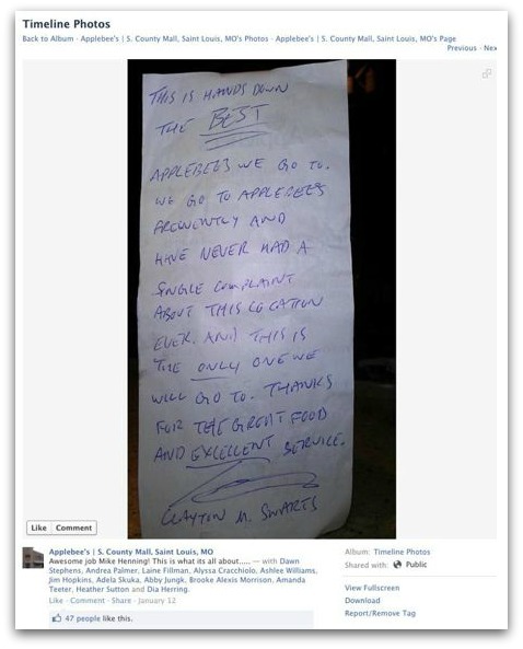 První chybou vedení pobočky Applebee’s ze St. Louis byla neadekvátní reakce (tj. okamžité propuštění) na relativně malý, ale již veřejně probíraný prohřešek pracovníka. Avšak stalo se. Někdo ve firmě si uvědomil z toho plynoucí informační vakuum a přišel s oficiálním statusem na Facebooku – s právně korektním (a taky tak bohužel znějícím!) důvodem propuštění. Tím bylo údajně jen a pouze porušení důvěry a ohrožení soukromí zákazníka zveřejněním jeho jména na konkrétní účtence (o tom by se dalo silně pochybovat). Link k tomuto statusu naleznete zde.