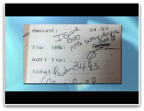 Jedna číšnice amerického restauračního řetězce Applebee’s byla propuštěna z práce poté, co na sociální síti Reddit publikovala pokladní účtenku pastora Aloise Bella, na částku 34.93USD (vystavený její kolegyní) s navrhovaným firemním spropitným ve výši 18%, doplněný jeho kousavým komentářem: bohu dávám 10%, tak proč se vy opovažujete žádat o 18%? Nikde žádná zmínka o špatné obsluze nebo nespokojenosti, pastor navíc navrhované spropitné následně seškrtal na nulu, což lze vyhodnotit jako poněkud neomalené chování (mohl dát „božích“ 10%).