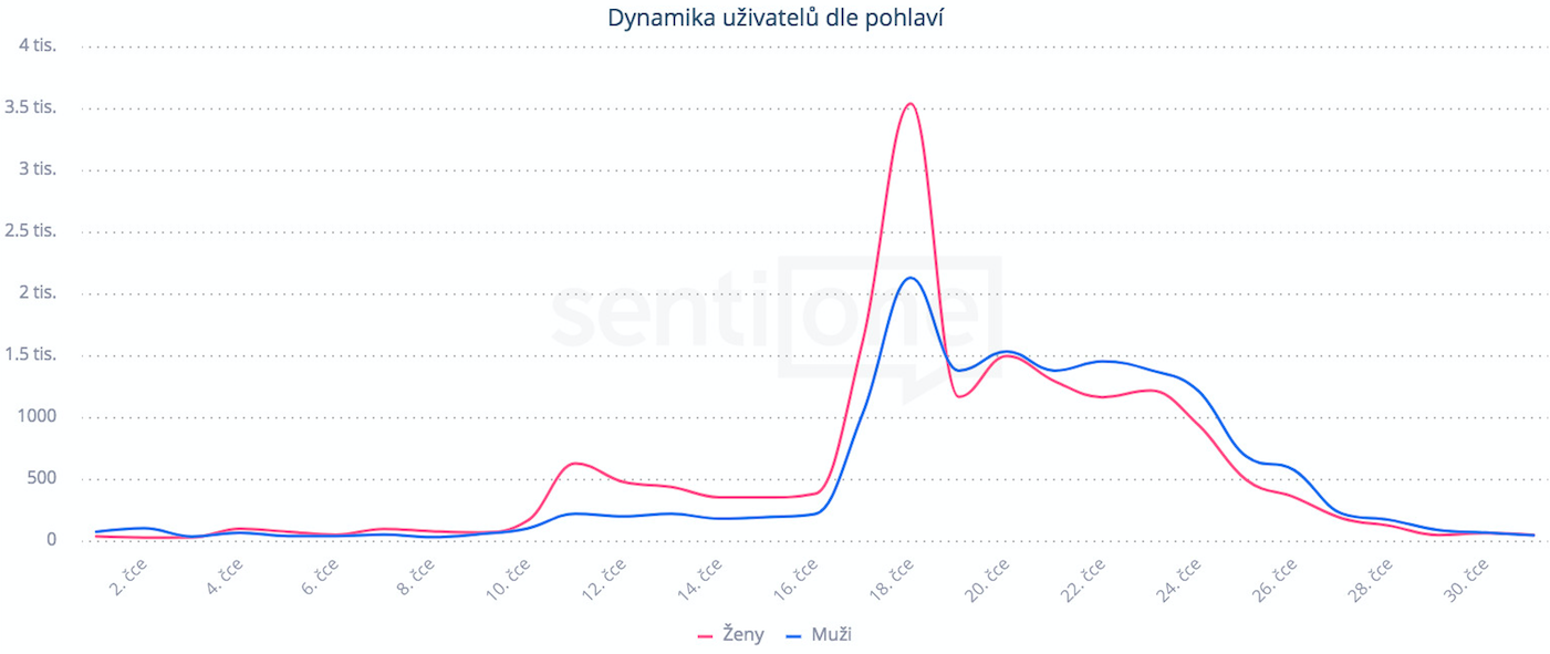 Zmínky v čase podle pohlaví. Téma: Colors of Ostrava. Zdroj: SentiOne.