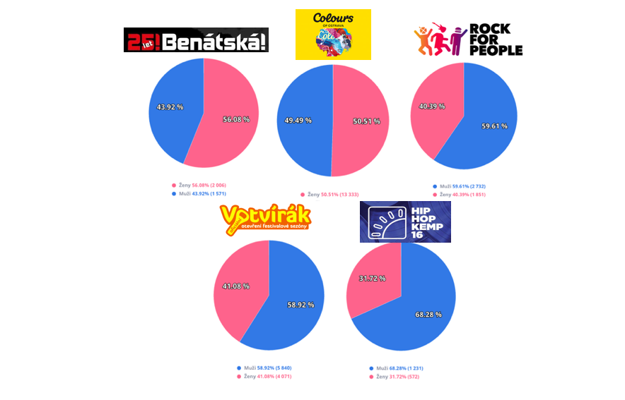 Na základě online příspěvků, na Hip Hop Kempu a Rock for People o sobě dávali nejvíce vědět muži. Zatímco dámská část účastníků byla nejsdílnější na Benátské noci.