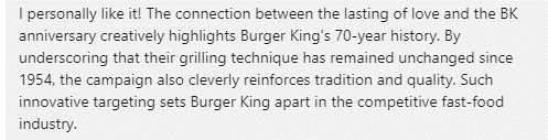 Los autores de esta creación (una agencia de marketing con sede en Buenos Aires) señalaron que “las viejas llamas mantienen viva su perversa pasión después de todos estos años, tan calientes como el primer día, igual que Burger King se asa en llamas desde 1954”. La analogía es muy acertada y el creador de este eslogan debería ser elogiado, como sostienen los internautas en los comentarios: