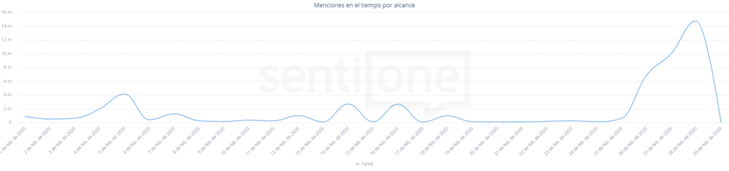 De esta forma, el 30 de enero SentiOne registró una subida significativa en las menciones de Lysol, como puede observarse en la siguiente gráfica:
