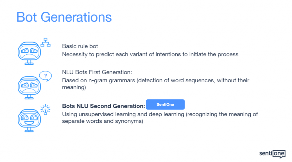 Los bots conversacionales más avanzados se basan en soluciones innovadoras como AI (inteligencia artificial), NLU (comprensión del lenguaje natural) o ML (aprendizaje automático). Facilitan (desde el punto de vista de la persona que configura el bot) y efectivamente entrenar al bot para que reconozca las intenciones del cliente, incluso si están formuladas de muchas maneras diferentes. Gracias a las nuevas tecnologías, los bots pueden recordar datos y desarrollarse sin interferencia humana.