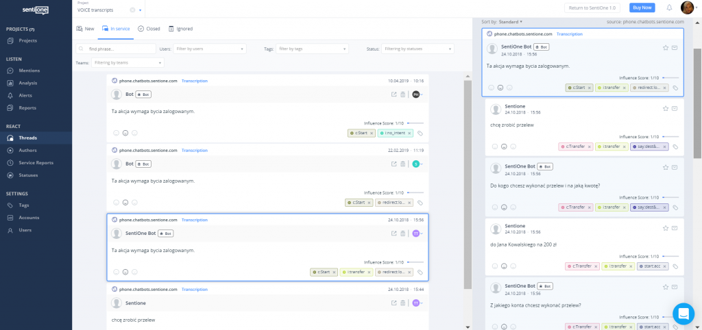 Gracias a las herramientas desarrolladas para monitorear las social mentions de Internet, como SentiOne, podemos verificar fácilmente los cambios en el número de menciones de la marca, su sentimiento, y también mirar más de cerca las opiniones de los clientes para descubrir cómo reaccionan los clientes ante la presencia del bot. Los bots implementados por SentiOne están integrados con el módulo Speech Analytics and Reporting, que permite el análisis en tiempo real del trabajo del bot y la corrección de la efectividad del reconocimiento de intenciones.