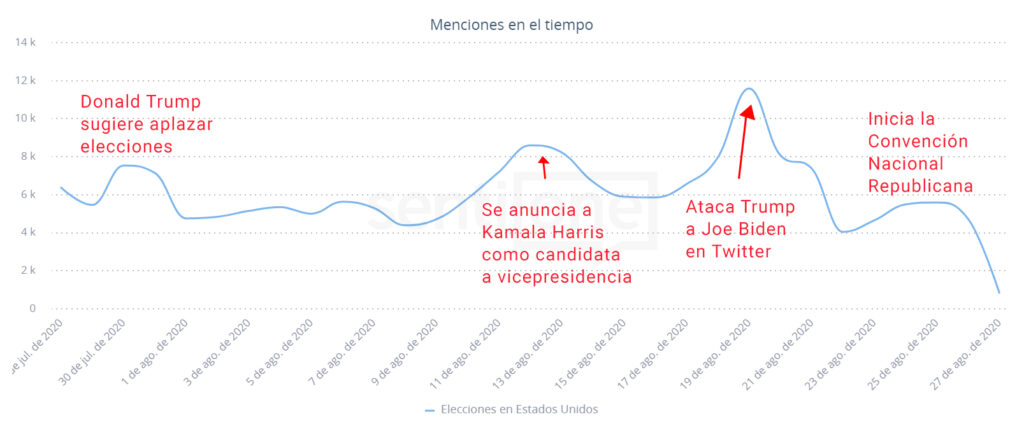• 24 de agosto: El inicio de la Convención Nacional Republicana generó este pico de atención sin duda, aunque con menores resultados que el evento demócrata, pues las menciones bajaron a unas 222 mil.
