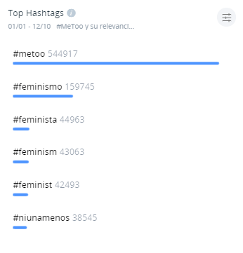En cuanto a los hashtags, el más mencionado fue obviamente #MeToo, pero también feminismo, feminista, feminism, feminist y #NiUnaMenos.
