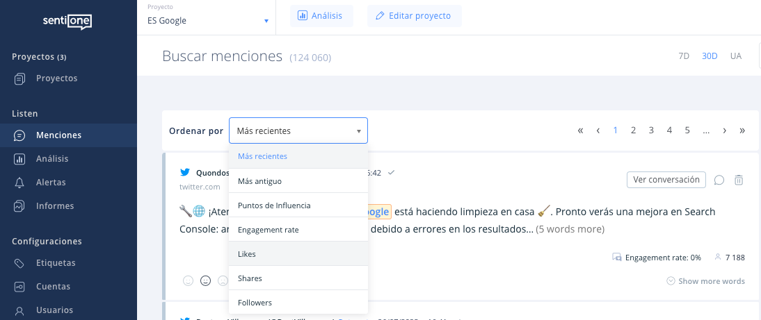 Sabemos que el tiempo es oro, por eso añadimos más opciones para organizar la información que encuentres sobre tu marca y la puedas analizar de acuerdo a tus necesidades. Las opciones para filtrar por ‘Likes’, ‘Shares’ y ‘Followers’ ya están disponibles y las podrás encontrar en los apartados de Menciones y Análisis.