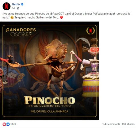 - ‘Pinocho’ del director mexicano Guillermo del Toro ganó este domingo el Óscar a mejor película de animación. Esta noticia logró que Guillermo del Toro tenga un alcance aproximado de hasta 1,560 millones a la fecha.