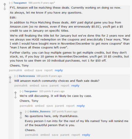 Follow the example of Tony, an Amazon rep who would frequent the r/GameDeals subreddit — where users shared information about video game discounts and promotions. Every time Amazon happened to have a better deal than what was posted, Tony would be there, like in the post below. Notice his approach: first, he’s transparent about being an Amazon employee. Second of all, he’s providing value to the redditors he’s engaging with.