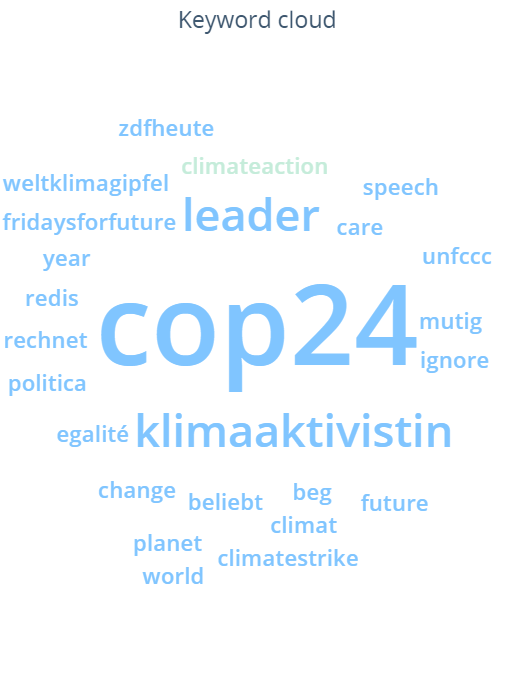 Keyword clouds for “Greta Thunberg” from the COP24 and last school strike periods leave no doubts either: