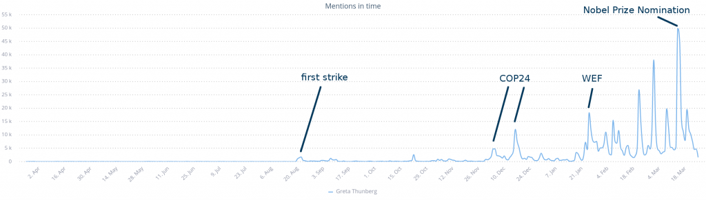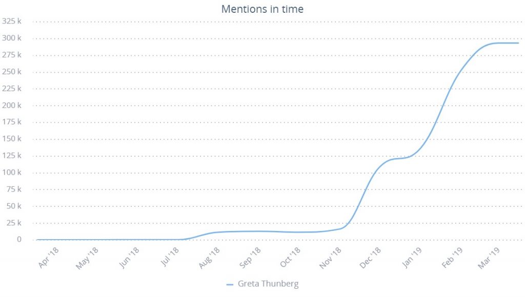 Mentions in time relating to Greta Thunberg in the last year, source: SentiOne