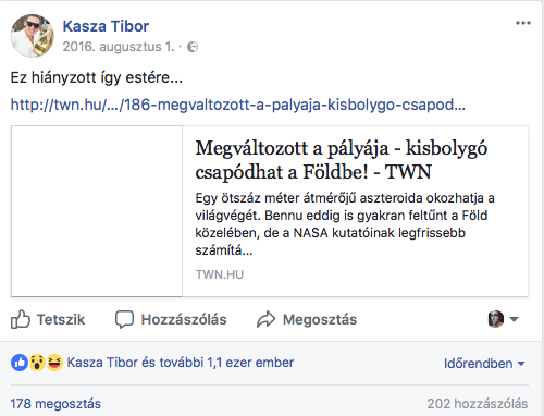 2016. augusztus 1-jén első körben a Blikk írta, hogy vége mindennek: “a NASA szerint hatalmas meteor csapódhat a Földbe! A NASA tudósai komoly figyelmeztetést adtak ki, ugyanis idézem a Mirroron keresztül Dante Lauretta, NASA kutató szavait: “mérhetetlen szenvedést és halált okozhat az égitest (Bennu aszteroida) becsapódása”.