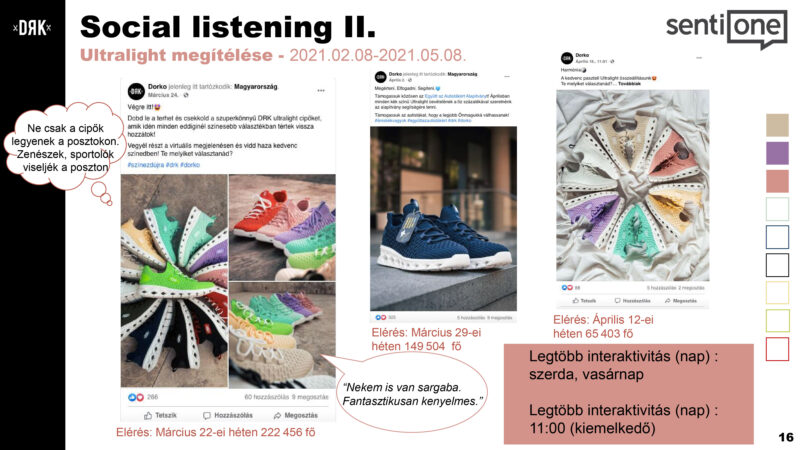 “Nekem is van sargaba. Fantasztikusan kényelmes.” Ilyen és ehhez hasonló kommentek érkeztek a poszt alá. Sokan kommenteltek arról, hogy nekik milyen színű van, vagy milyen színűt szeretnének. Ezen a héten 222 456 fő volt az elérés szám. A következő héten is megfigyelhető volt, hogy az említések száma magasan volt, ez az április 2-ai posztnak volt köszönhető, amelyben minden kék Ultralight cipő bevételéből 10 %-ot az Együtt az Autistákért alapítvány kapta áprilisban. Ekkor nem csak a Facebookon nőtt meg az említések száma, de számos cikk is megjelent a kezdeményezésről (Glamour, cseppek.hu, markamonitor.hu, medicalonline.hu, noklapja.hu, onbrands.hu, storeinsider.hu). 149 504 főt sikerült elérni. Ez után az említések száma visszaesett, kisebb kiugrás az április 18-ai poszt hatására volt tapasztalható, az Ultralight pasztell színekkel kapcsolatban, akkor az elérés száma 65 403 fő volt. A legtöbb interaktivitás szerdán és vasárnap érkezett. A legaktívabbak az emberek 11:00-kor (kiemelkedően magas) voltak, de 12:00 és 16:00 között is kiemelkedően magas, valamint 19:00 és 20:00 között figyelhető meg egy kis kiugrás.