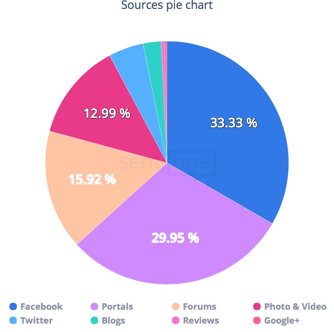 Az online listening adatai mentén kirajzolódó forrásmegoszlás kördiagramján első helyen a weboldak állnak, ezt követi a Facebook, a fórumok, a YouTube és az Instagram.