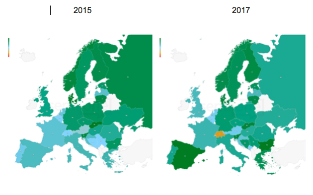 Ugyanakkor a kontinentális paletta sok szempontból differenciált képet mutat, főleg, ha a 2015-ös eredményeket vetjük össze az idei adatokkal. Az alábbi képek Európa 2015-ös és 2017-es érzelmi térképét mutatják. A SentiOne kb. 75%-os pontossággal képes egy pozitív és negatív érzelmi skálán kategorizálni az egyes bejegyzéseket a nyelvi attribútumok, a kontextus, a konkrét szavak és a hozzáadott emotikonok elemzése mentén. Minél zöldebb a terület, annál több a pozitív online tartalom mennyisége a Movemberrel kapcsolatban. Az északi régió konzekvensen élen jár a mozgalom pozitív megítélésében és online felölelésében.