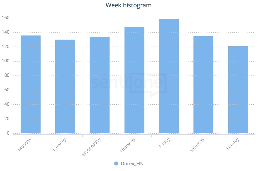 A hétvége közeledtével pedig előszeretettel evezünk intimebb vizekre is. A Durexet említő internetfelhasználók online megosztott élményeit vizsgálva ez a márka is legtöbbször pénteken juttat minket a csúcsra.