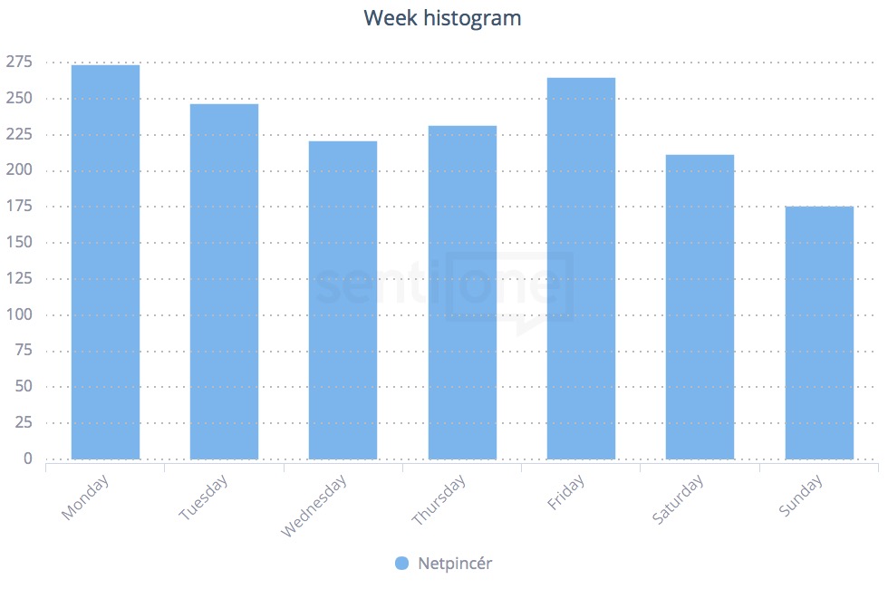 Ha hétfő, akkor például Netpincér. Lehet, azt gondolnánk: hétvégén van rá a legnagyobb szükségünk, ugyanakkor az ezzel kapcsolatos webes kommunikációs dömping bizony hétfőn landol az interneten. Vajon azért, mert hétvégén mi magunk főzünk otthon? Vagy mert pont, hogy nem főzünk, és nincs mit ennünk a hétfői ebédszünetben? Az eredmények mögötti konkrét miértek persze kideríthetők a SentiOne-ból.