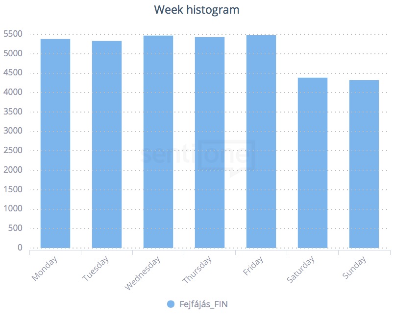 Ha a fejünk fáj, és meg is akarjuk osztani a világgal (jellemzően mindent meg akarunk osztani a világgal), akkor ezt általában hét közben tesszük. Hétvégén valamiért nyoma sincs (illetve van, de alig) a fejfájos embereknek az interneten. Konkrétan arra kerestünk rá, hogy a ‘fáj a fejem’, ‘fajafejem’ hashtag, ‘migrénem van’ és ‘migren’ kulcsszó és hashtag milyen eredményeket hoz a tavalyi évből. Így néz ki tehát fejfájásunk heti beosztása.