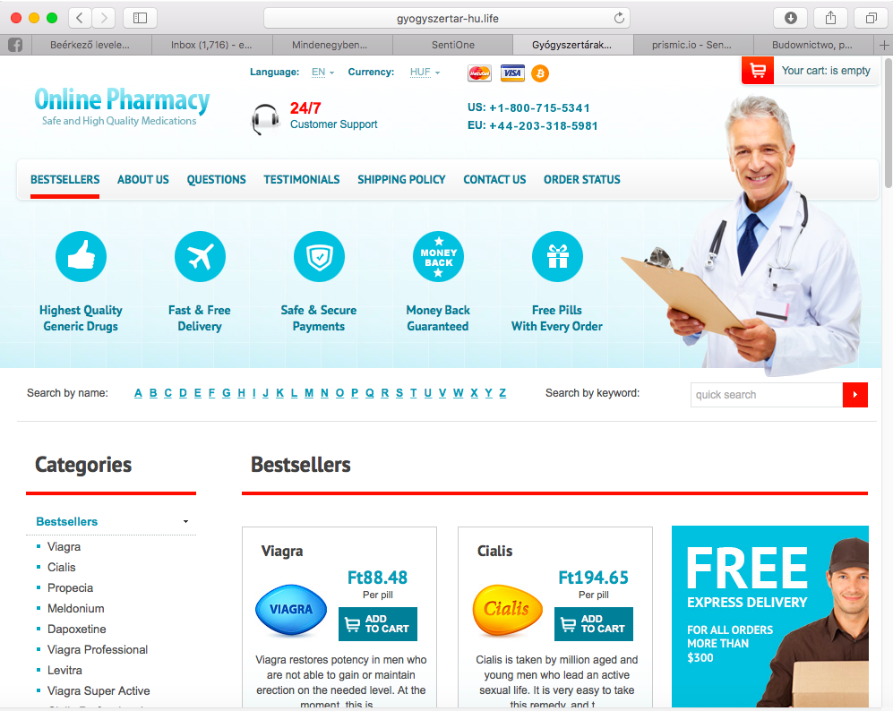 A gyogyszertar-hu.life vagy épp a gyogyszertaronlinehu.life bizalomgerjesztő domain címei alatt egyrészt találunk egy rakat bestseller terméket (gyógyszert). Másrészt egy angol nyelvű oldalt (ami amúgy egyáltalán nem érhető el magyarul, a nyelvek opcióra kattintva SEM.)