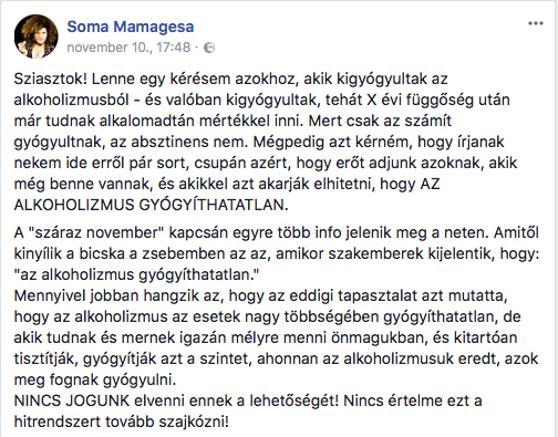 A második nagy online kommenthullám november 12-én ért partot Soma Mamagésa Facebook oldalán.