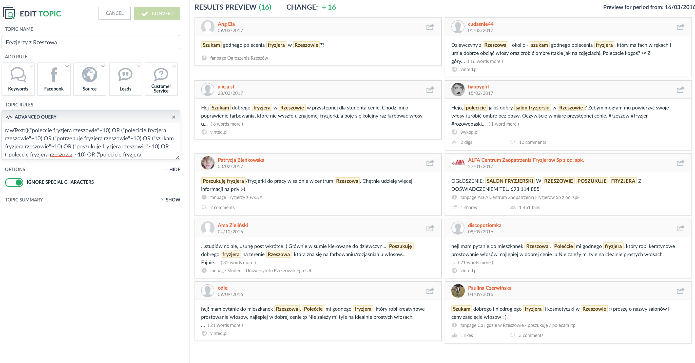System jest skoncentrowany na wychwyceniu takich wyników, które są atrakcyjne z perspektywy biznesowej. Zaliczają się do nich zarówno wypowiedzi wyrażające chęć zakupu określonego produktu/usługi, poszukiwanie rekomendacji i sugestii, ale również wzmianki z obszaru obsługi klienta lub reklamacji.