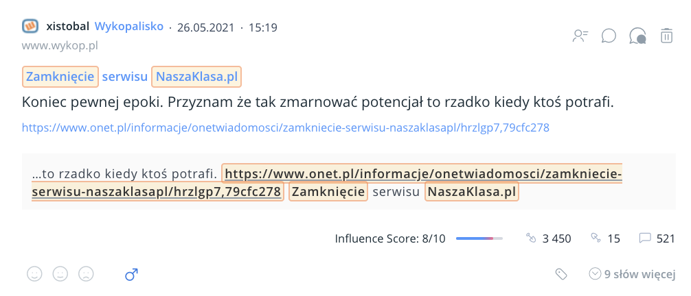 Smutkiem i nostalgią. Patrząc na wyniki monitoringu internetu, galeria sharowanych memów i grafik nie pozostawia złudzeń: smutek, szok i niedowierzanie. Przeanalizowaliśmy też zamknięcie naszej-klasy algorytmami sztucznej inteligencji, które badają emocje wypowiedzi. Dominującą emocją był smutek (73%) następnie złość (19%).