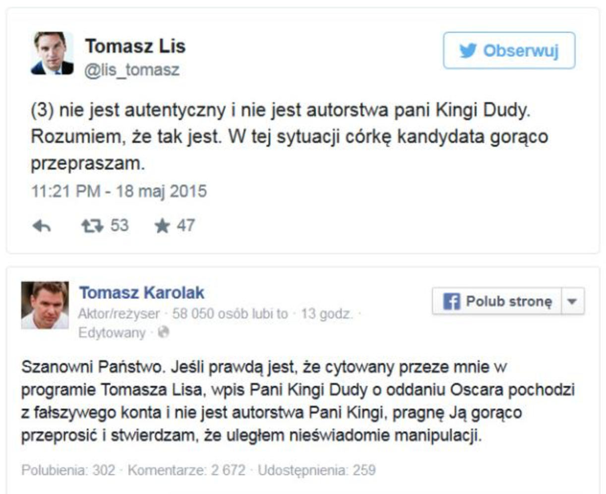 Poniżej przykład sytuacji, która miała miejsce w 2015 roku. Tomasz Lis przygotowując się do programu telewizyjnego nie zweryfikował źródła i wykorzystał dane opublikowane na fałszywym profilu osoby podszywającej się pod córkę kandydata na prezydenta.