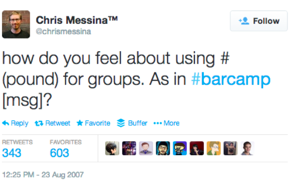 Znak # początkowo służył w internecie do oznaczania konkretnych słów, o specjalnym znaczeniu. Początki masowego użycia tego symbolu sięgają lat 70. (!),kiedy to stosowano go do określania grup i katalogowania tematów w komunikatorze IRC. Wraz z końcem popularności narzędzia, umarł także hashtag i to na długie lata. W 2007 roku wskrzesił go pracownik Google, Chris Messina, zadając na twitterze pytanie “Co myślicie o użyciu # dla grupowania dyskusji?”.