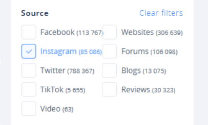 Możesz teraz spróbować kilku ciekawych sztuczek. Jak widać, przed nami mnóstwo wzmianek do przejrzenia — to nie lada wyzwanie, nawet dla najbardziej zagorzałych brand managerów. Spróbujmy zatem zawęzić wyniki. Filtrowanie pozwala nam m.in. wybrać tylko takie wypowiedzi, które pochodzą z konkretnego źródła, np. z Instagrama.
