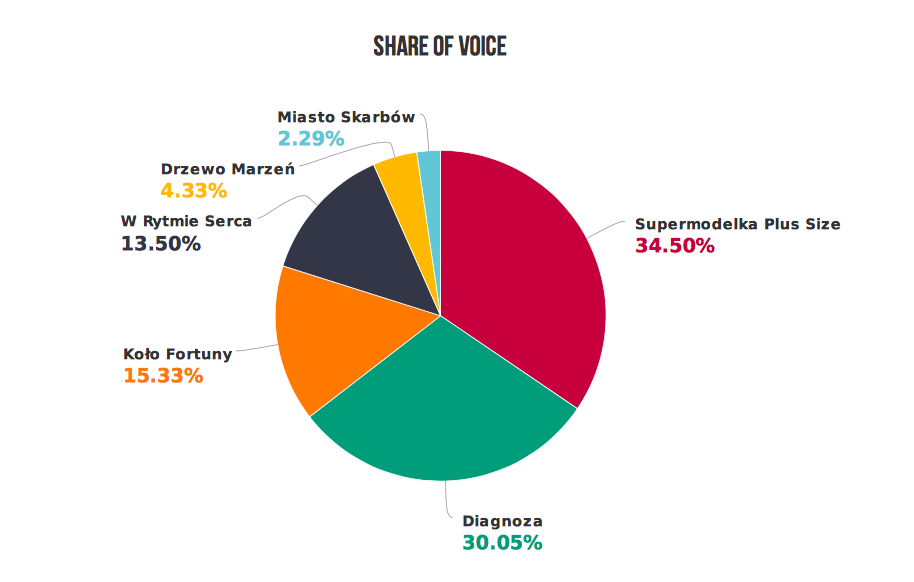Patrząc na sumaryczną liczbę wzmianek, największą lawinę komentarzy wywołała “#Supermodelka Plus Size”. Do spółki z serialem “W rytmie serca” zgarnęła prawie 50% wypowiedzi i tym samym możemy uznać, że nasze prowizoryczne, mini-igrzyska wygrał Polsat!
