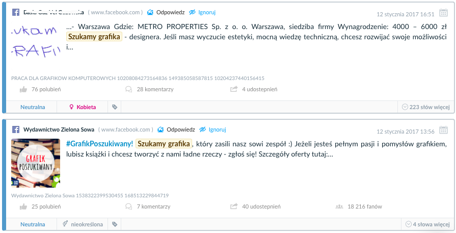 Przykładowe wypowiedzi w temacie “Szukam pracy”. Widok w panelu “wzmianki” SentiOne.