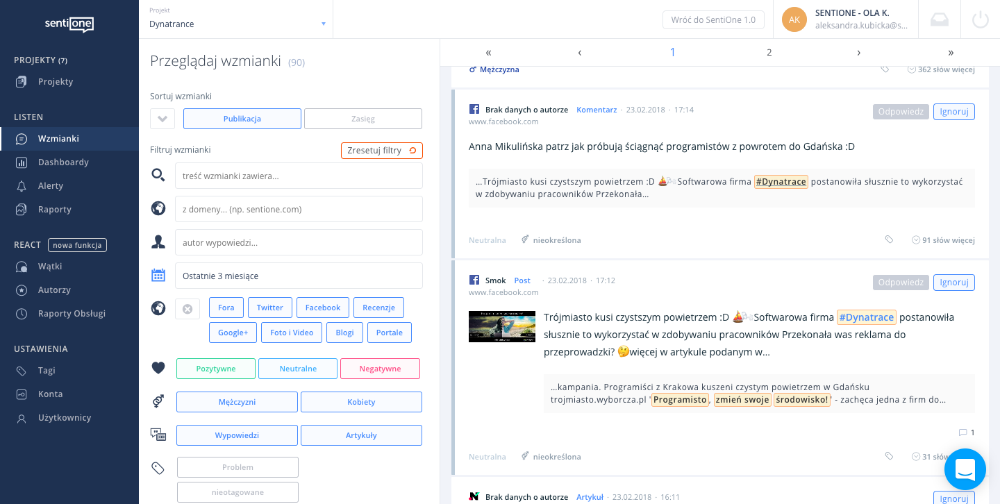 W SentiOne możesz ustawić projekt dedykowany pod twoją kampanię i ją monitorować. Dodatkowo, za pomocą dashboardu, możesz zobaczyć całe podsumowanie projektu z takimi informacjami jak np. dynamika wzmianek (czyli kiedy najczęściej pisano o kampanii), wydźwięk (jak pisano), rozkład płci (kto pisał), na jakich domenach (gdzie) itp.