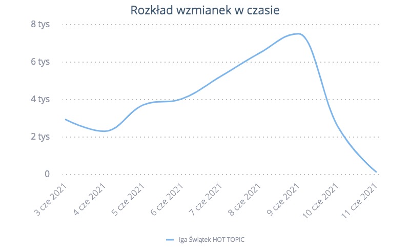 Powód? Iga grała codziennie od dwóch tygodni: na zmianę mecze singlowe i deblowe i aż do etapu ćwierćfinału wygrywała wszystkie w fenomenalnym stylu. Patrząc na rozkład wzmianek w czasie widzimy jak dyskusja narastała z dnia na dzień i pół internetu śledziło każdy mecz Igi. Niestety 9 czerwca Iga przegrała w singlowy ćwierćfinale z Greczynką Marią Sakkari i od tego dnia zauważamy spadek dyskusji internautów.