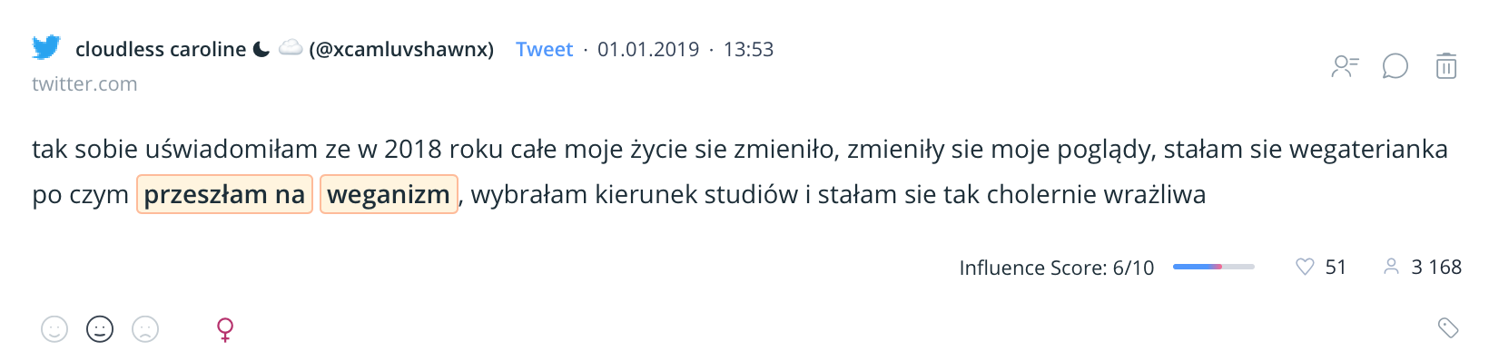 Na wstępie przeanalizowałam, jaka jest liczba wszystkich deklaracji, które zamknąć można w słowach “przechodzę na weganizm” czy “rzucam mięso”. Od 2016 roku, do połowy 2019 liczba stwierdzeń tego typu w polskiej sieci publicznej to 23 462 wzmianek.