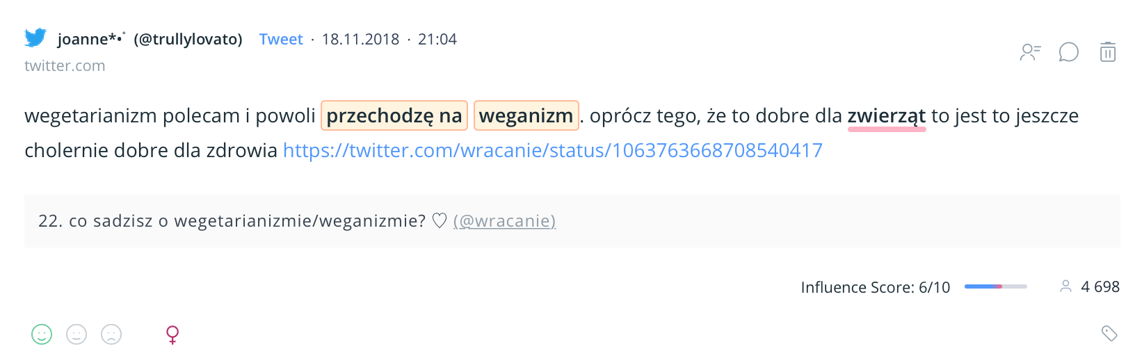 Donald Watson stworzył termin „weganizm” w 1944 roku. Od tego czasu zainteresowanie weganizmem rozwija się nieprzerwanie. Wciągu 5 lat liczba wzmianek na temat wykuczania produktów odzwierzęcych wzrosła o kilka tysięcy procent. Weganizm przestał być tylko dietą wykluczającą mięso, a zaczął całą ideologią. Najwięcej na ten temat publikują w Polsce kobiety, a trzy czwarte wspomnianych dyskusji toczy się w mediach społecznościowych. Ponieważ konfiguracja projektu w Sentione wymaga dokładnego predefiniowania badanego tematu, mój wpis porusza ledwie kilka aspektów związanych z dyskusjami na temat weganizmu w sieci. Jestem przekonana, że różne aspekty związane z byciem WEGE możemy analizować w nieskończoność.