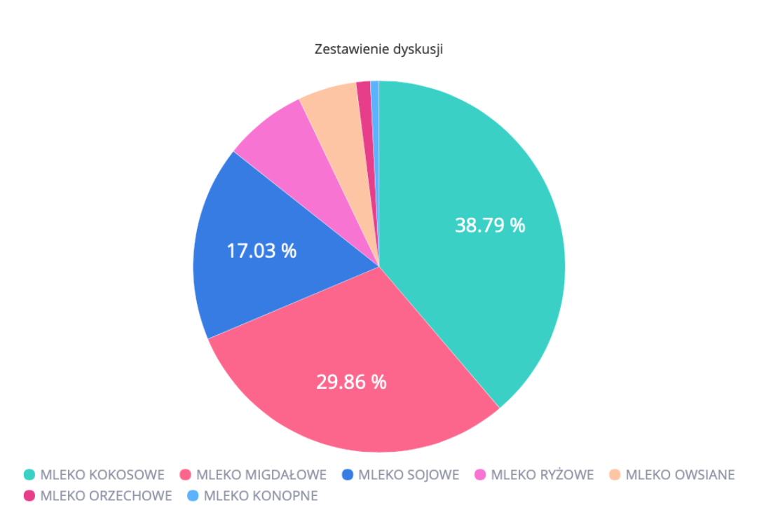 Najrzadziej wzmiankowano o mleku konopnym. Najwięcej pozytywnych wzmianek odnosiło się do mleka owsianego. Mleko konopne wzbudzało u internautów najwięcej negatywnych emocji (nieco ponad 3% wszystkich wypowiedzi o napoju).