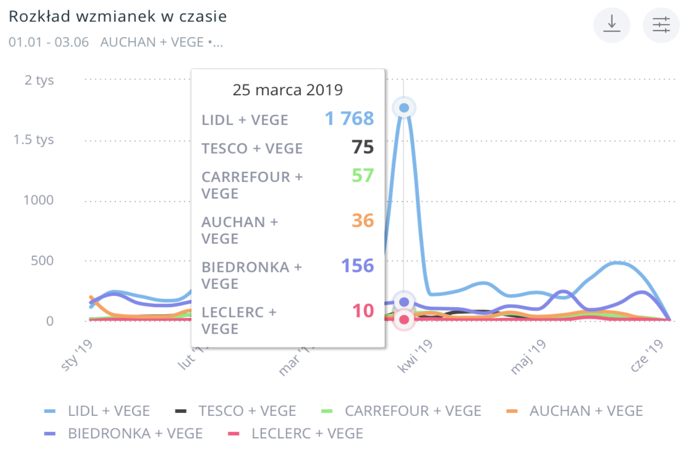 Największe natężenie dyskusji związanych z wegańskim asortymentem sklepowym miało miejsce w kontekście Lidla, 25 i 26 oraz 27 marca. Dyskusje dotyczyły promocji – tygodnia zdrowej żywności oraz specjalnej oferty produktowej sklepu. Największe poruszenie wśród internautów wywołało wprowadzenie do oferty bezmięsnych klopsów i burgerów.