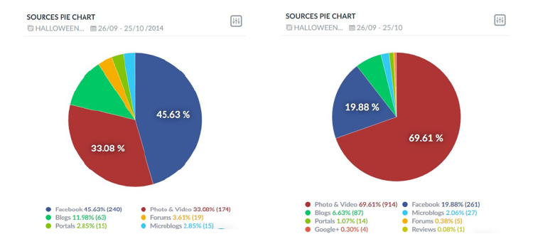 In 2014 Facebook was still the number one platform, while in 2016 it had a huge fallback representing only a poor 20% of the total social communication with regard to the Halloween make-up topic.
