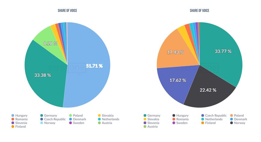 That tendency is reflected also in the number of mentions regarding these two categories. While the share of countries for fat burners is ruled by Hungary (on the left side), the chart portraying the results of weight gainer related online chit-chats (by number of mentions), well, it paints quite a different picture. The chart is ruled by Germany, Hungary is the 2nd, but Checz Republic and Poland are closing up to them (on the right side).