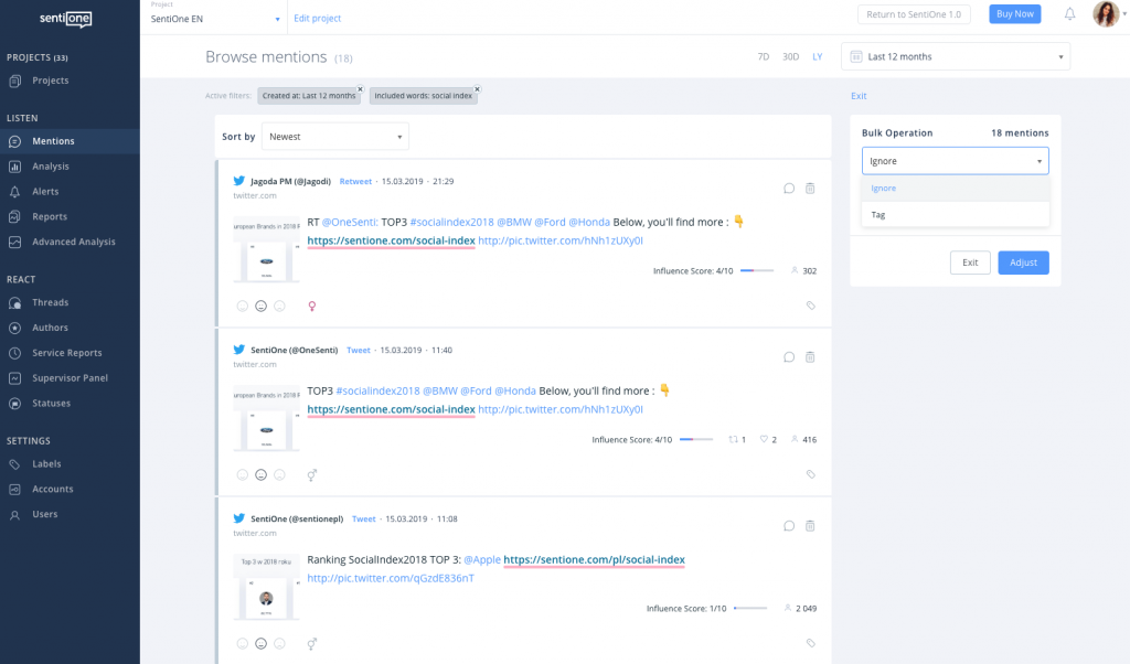 Bulk operation which allows tagging multiple mentions with applied filters at once.