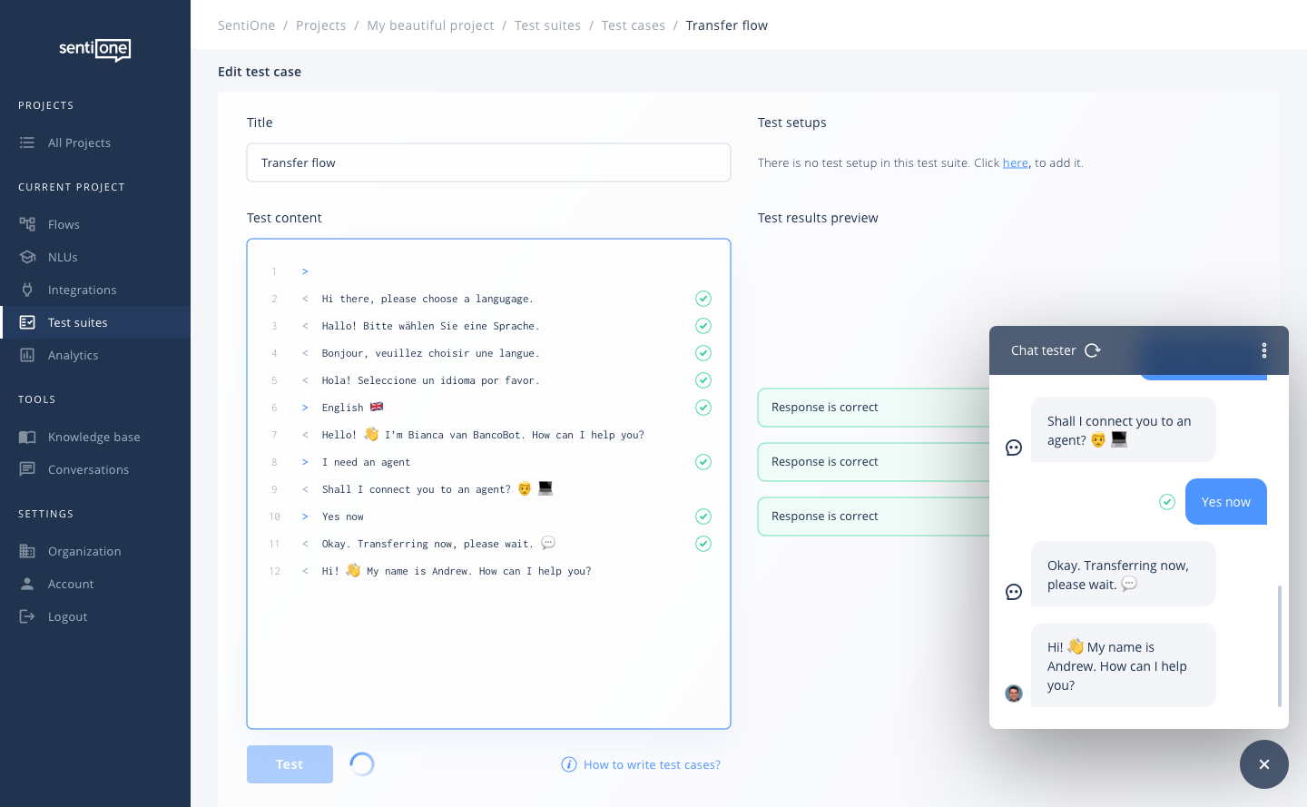 SentiOne Automate comes with a built-in bot testing feature. No need to use external tools!